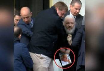 ما هو الكتاب الذي ظهر بيد مؤسس ويكيليكس لحظة اعتقاله؟