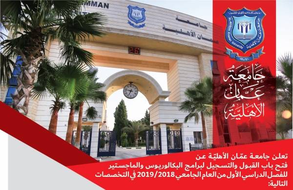 اعلان عن فتح باب القبول والتسجيل للفصل الدراسي الاول 2018-2019 في جامعة عمان الاهلية