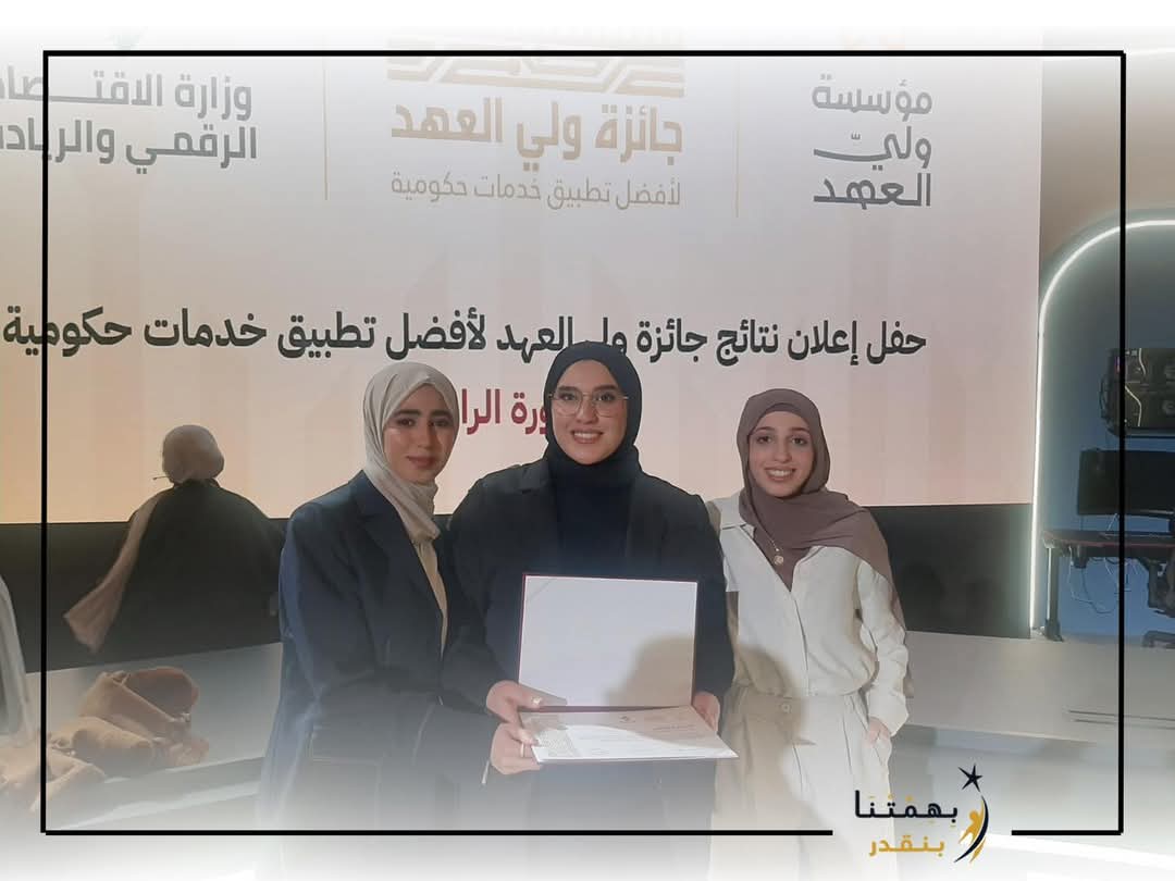 الطالب عنان دادر يهنىء زميلاته من كلية تكنولوجيا المعلومات بحصولهن على المركز السابع من بين أكثر (120) مشروعاً في جائزة ولي العهد