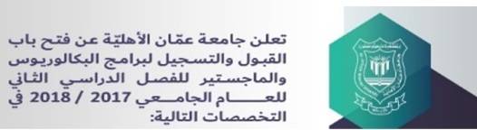 تعلن جامعة عمان الاهلية عن فتح باب القبول والتسجيل لبرامج البكالوريوس والماجستير للفصل الدراسي لعام 2017/2018