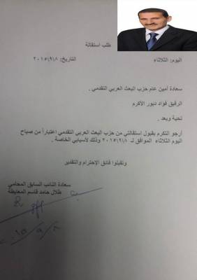 النائب المعايطة : يقدم استقالته من حزب البعث العربي التقدمي .