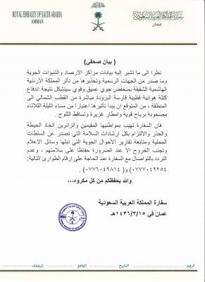 السفارة السعودية بالأردن تهيب برعاياها التزام الحيطة والحذر نظراً للاحوال الجوية المصحوبة بالثلوج