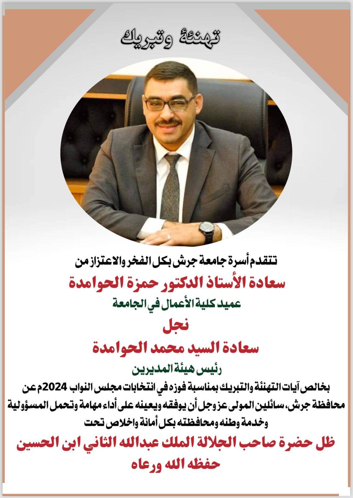 أسرة جامعة جرش تهنئ الدكتور حمزة الحوامدة بفوزه بانتخابات مجلس النواب 2024