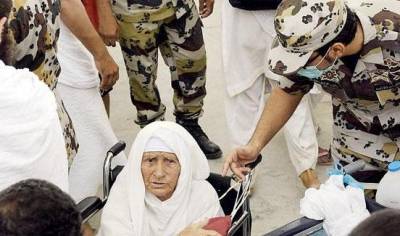 رجال الأمن السعودي يحملون الحاجة رحمة الله ذات التسعين عاما لرمي الجمرات