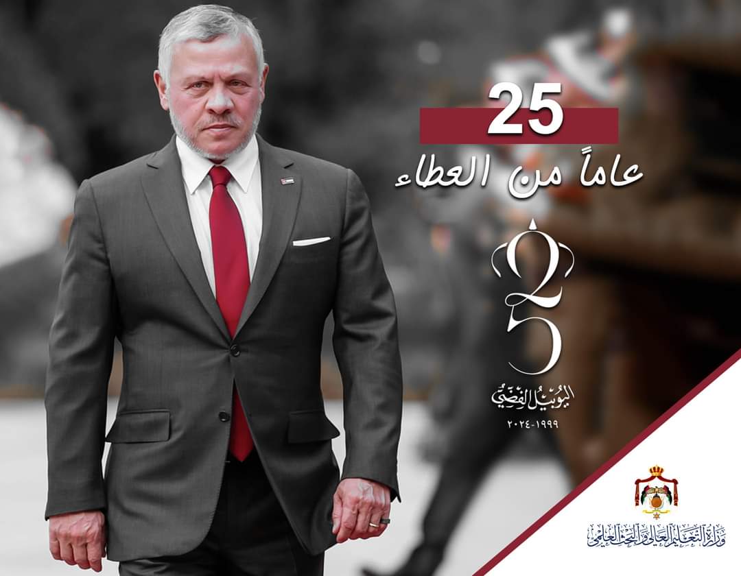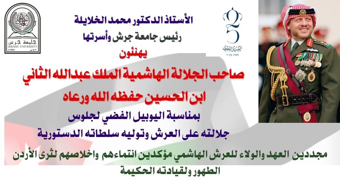 أسرة جامعة جرش تهنئ جلالة الملك بمناسبة اليوبيل الفضي لتسلم جلالته سلطاته الدستورية وجلوسه على العرش