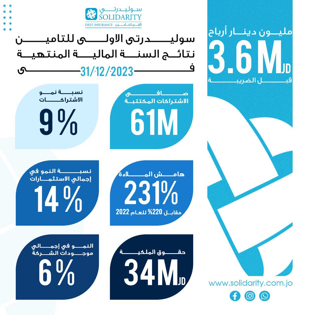 سولديرتي للتأمين تحقق ربحا 3.6 مليون دينار (قبل الضريبة) عن عام 2023 وأقساطها تجاوزت الـ 61 مليون دينار