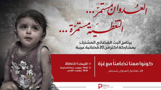 بث مشترك لقنوات عربية غدا الأربعاء تضامنا مع غزة