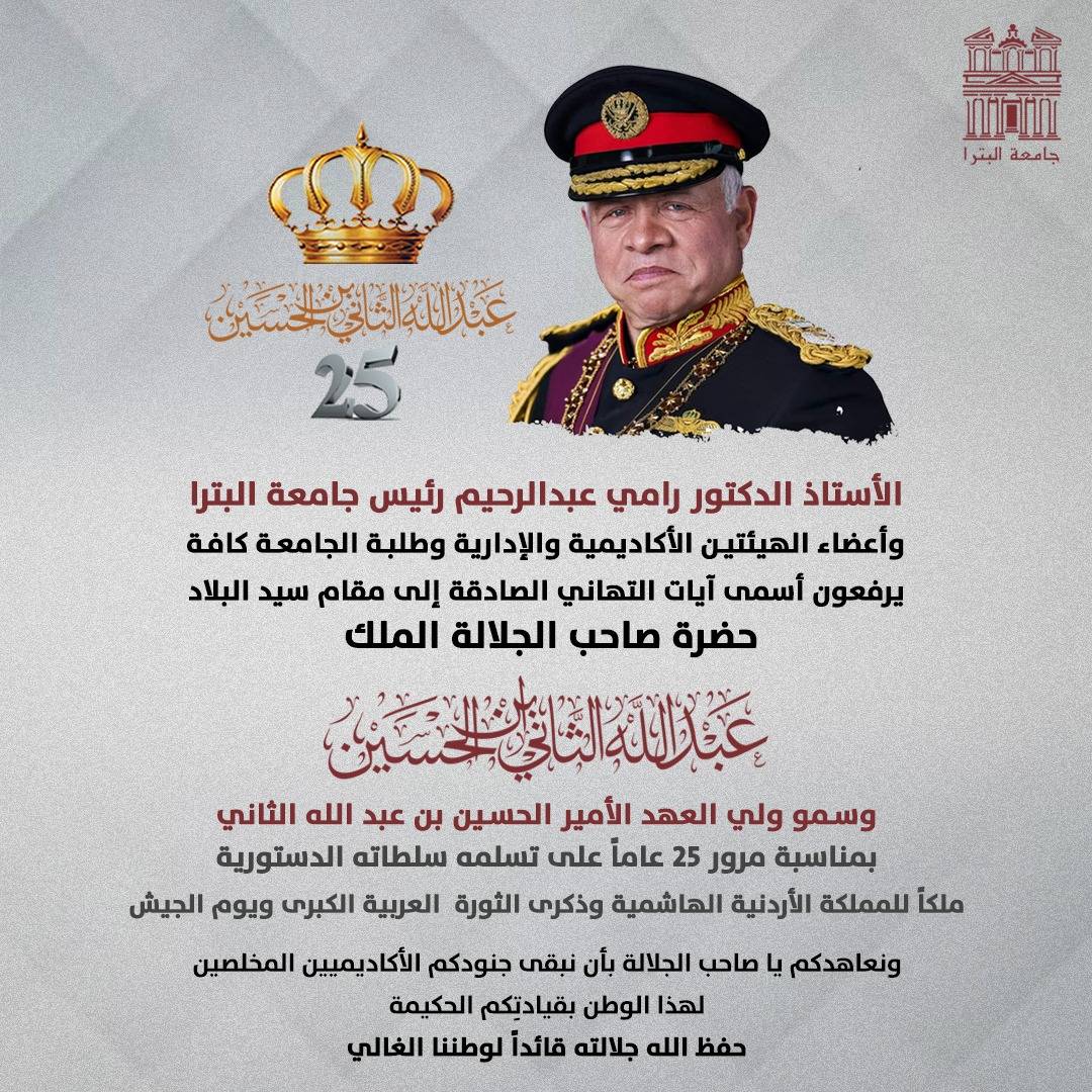 شركة البوتاس العربية تهنئ جلالة الملك عبدالله الثاني ابن الحسين المعظم بمناسبة مرور 25 عاماً على تولي جلالته سلطاته الدستورية.