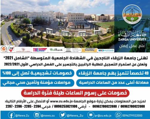 جامعة الزرقاء تهنىء وتبارك للناجحين في الشهادة الجامعية المتوسطة "الشامل 2021"