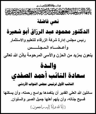 مجلس إدارة شركة الزرقاء للتعليم والاستثمار ينعون بمزيد من الحزن والأسى المرحومة بإذن الله تعالى والدة النائب أحمد الصفدي