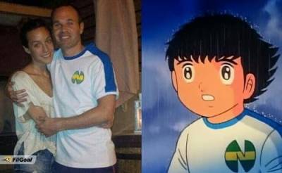 صورة: إنيستا يظهر بقميص "كابتن ماجد" بصحبة زوجته