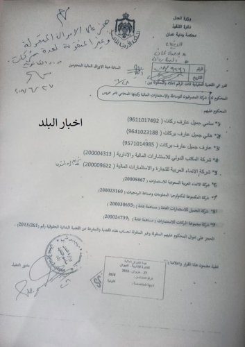قررت دائرة التنفيذ في محكمة بداية عمان الحجز على الاموال المنقولة وغير المنقولة على المحكوم عليهم في القضية التنفيذية التي تحمل رقم (2018/9296) والمتفرعة عن القضية البدائية الحقوقية رقم (2013/261) وهم :