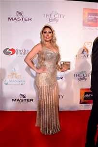 واختارت الفنانة زينة العلمي فستاناً شفافاً باللون الأبيض الداكن، مع خطوط ذهبية من تصميم مصمم الأزياء أحمد فايز.