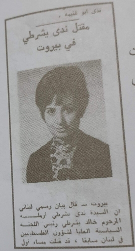 وقد اوردت صحيفة الدستور الأردنية خبر اغتيالها على الصفحة الاولى من عددها رقم 2072الصادر بتاريخ 4/5/1973م. مقتل ندى يشرطي في بيروت: